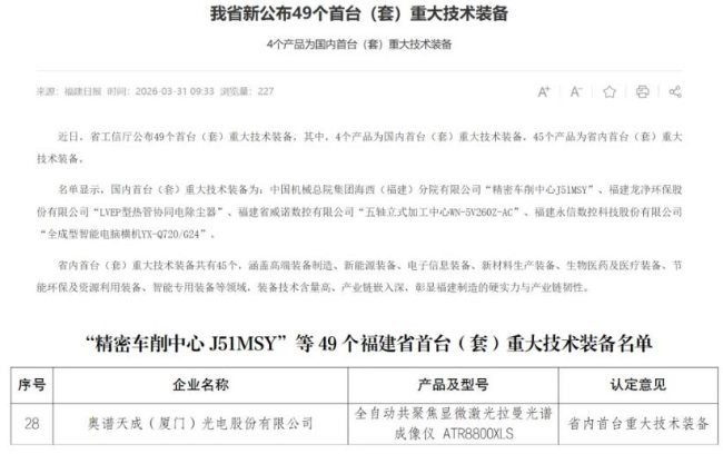 【仪器仪表网 厂商新闻】近日,奥谱天成自主研发的ATR8800XLS全自动共聚焦显微激光拉曼光谱成像仪,成功入选“福建省首台(套)重大技术装备”。该评定由省工信厅、财政厅联合组织,经过企业申报、市级初审、省级审查、专家评审、现场核查等多轮筛选,从全省数百项产品中择优认定。