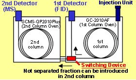 多维GC/GCMS系统使用两根不同极性的色谱柱分离样品。 在第一根色谱柱中(1st 色谱柱)中未能充分分离的组分将导入(中心切割)到第二根色谱柱(2nd 色谱柱)中进行进一步分离,从而实现常规的单柱系统难以达到的高分离性能。