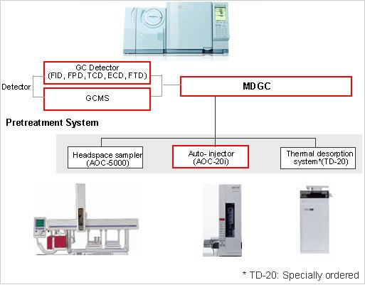 除MS外,MDGC/GCMS-2010可以使用FID或FPD等其他检测器。还可以连接和控制顶空进样器和热解析进样等前处理装置。在不作为MDGC使用时,通过变更检测器和色谱柱的连接,即可作为单独的GC和GCMS来使用。