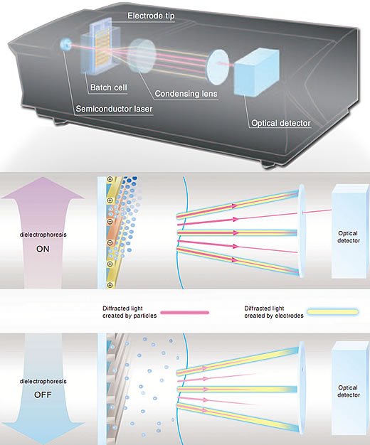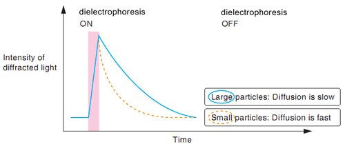 交变电压被应用于周期性排列的电极上,电场作用下微粒在液体中电泳并形成周期性浓度分布,聚集的微粒形成了衍射光栅。虽然微粒的周期浓度分布起到衍射光栅(粒子浓度光栅)的作用,但是如果停止交流电压,粒子将自由扩散并使光栅随之消失。