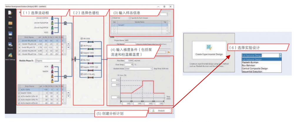 在LabSolutions MD方法开发软件界面上,创建筛选所需的大量方法文件和分析计划的过程可以通过以下步骤(1)到(6)快速完成。只需一次点击就可以选择流动相和色谱柱,并根据实验设计(DoE)创建下拉菜单即可一键生成综合分析计划表,不但包含所有需要考察的方法文件,并且自动创建所需柱平衡和空白分析计划。