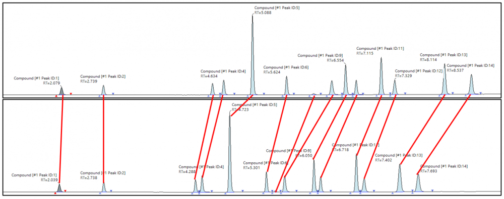 在方法开发过程中,化合物的保留时间会随着分析条件的变化而不同,在大量的数据下,如何高效准确的识别化合物,是一项非常困难的工作。LabSolutions MD可以根据UV光谱的相似度、峰高、峰面积等信息自动追踪不同保留时间的化合物,得到可信的化合物匹配结果。