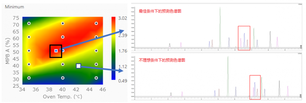 LabSolutions MD软件中可构建可视化的设计空间,通过绘制因素- 响应关系图,能够在图中直观的推荐的高稳健分析条件。并且支持色谱图模拟,准确的预测不同点位(不同参数)下的色谱图。