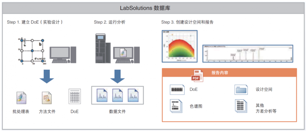 LabSolutions MD 软件基于“分析质量源于设计”(AQbD)理念,致力于帮助分析工作人员“轻松高效”“科学系统”的实现稳健的分析方法开发。相关的工作流程都可以使用LabSolutions MD完成,包括根据实验设计(DoE)分析样品,利用分析结果构建设计空间,以及在确定最佳分析条件后评估其稳健性。