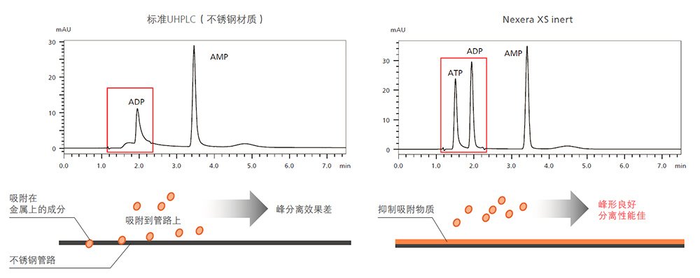 Nexera XS inert生物惰性系统使用岛津新开发技术,消除样品与内部金属表面的接触。从而抑制了样品流动通道内目标分子的吸附,确保了良好的峰形,并提供了出色的分离。