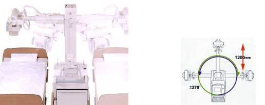 4、精确定位可左右自由旋转的套筒式支柱和可伸展球管支持臂,覆盖面积宽广,定位灵活、精确。球管臂可以大范围左右旋转,在狭小的病房内无需移动主机就可以对任何位置的患者进行投照定位,极大地减轻操作者的工作负担。独创的电动微动模式,使床旁各部位的精确定位操作简单、快捷。