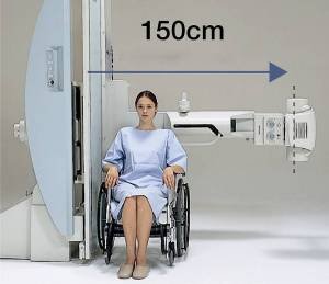 应对乘坐轮椅的重症患者,由于有1.5米的大SID可以提供足够的检察空间,使患者坐在轮椅上就可以接受检查,减少患者的痛苦,减轻操作者的负担,更减少了发生意外的风险。并且由于更大的SID,使图像的放大率有效降低,可以明显地提高成像质量。