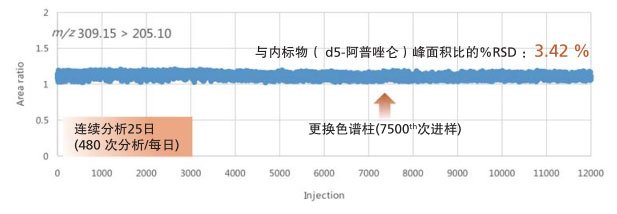 图为5ng/mL的阿普唑仑血浆样品经有机试剂沉淀蛋白后,连续25日分析,共12000次进样的结果。