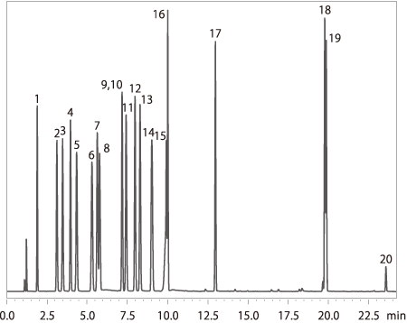 1 甲硫醇 2 乙硫醇 3 二甲基硫 4 二硫化碳 5 异丙硫醇 6 叔丁基硫醇 7 丙硫醇 8 甲基乙基硫醚 9 噻吩 10 2-丁硫醇 | 11 异丁硫醇 12 乙硫醚 13 丁硫醇 14 二甲基二硫 15 2-甲基噻吩 16 3-甲基噻吩 17 二乙基二硫醚 18 5-甲基苯并噻吩 19 3-甲基苯噻吩 20 二苯硫醚(内标) |