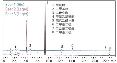啤酒中的硫化物是在制造工序中或在制造后因保存方法不当等原因生成的,会影响到啤酒的口感。使用本系统,可以在省去啤酒浓缩操作的情况下,高灵敏度分析啤酒中硫化物成分。