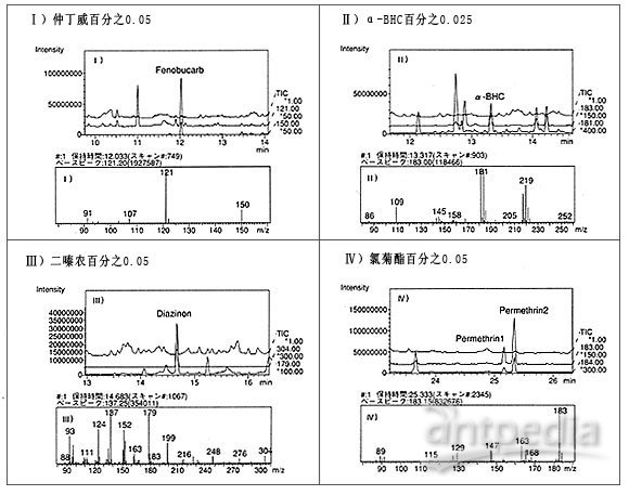 采用GC-MS对多种农药组分进行同步分析(筛选分析)。