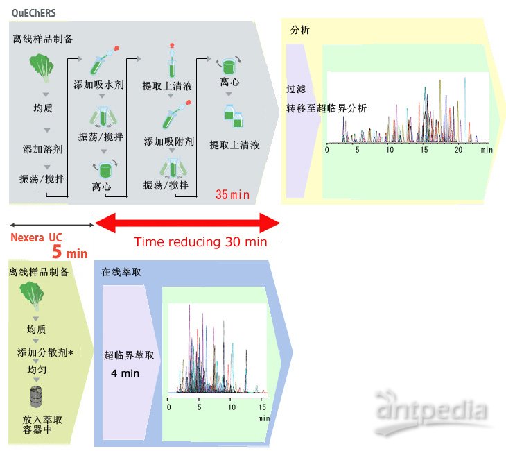 农药残留分析过程中QuEChERS方法与Nexera UC方法对比QuEChERS作为样品前处理的典型方法,需要诸多人工操作,并且耗费大概35分钟的时间。而Nexera UC,同样的样品使用在线SFE/SFC分析方法仅需要大约5分钟时间用于样品前处理,且人工操作步骤大大减少。