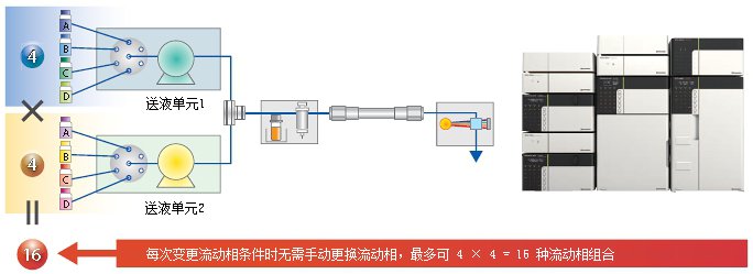 如果在Nexera X2二元梯度系统上追加低压梯度单元,则每台送液单元可以自动切换4路流动相。即配备2台送液单元的系统可以实现16种的流动相组合方式。