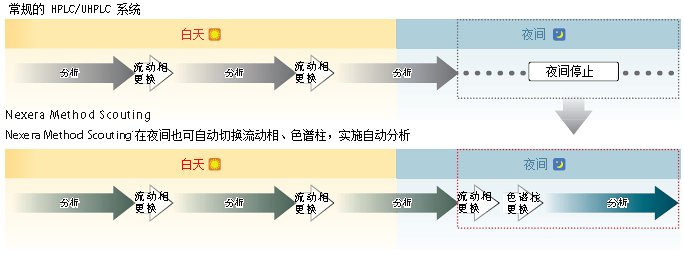 Nexera Method Scouting系统为方法开发系统,可以使用色谱柱最多6根,流动相8种,可自动切换多至96种的色谱柱与流动相的组合,源源不断地获取数据。即使在夜间也可持续地自动采集数据,实现高效率的方法开发。