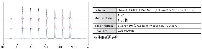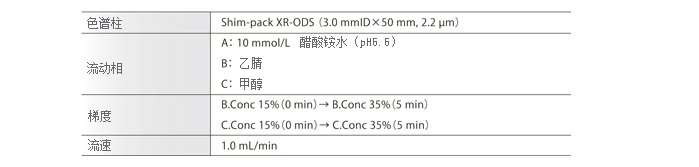 下例表示在送液单元X的流动相瓶A和B内准备磷酸水溶液以及磷酸氢二钠,利用流动相混合功能自动配制缓冲溶液的结果。并在一侧的送液单元上放置有机溶剂,可以在自动配制缓冲溶液的同时,进行与有机溶剂的梯度混合。在优化后的流动相组成时,大幅降低了时间与溶剂的消耗。