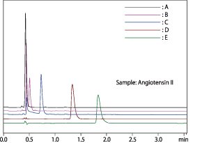 利用流动相混合功能,实现酸添加量的优化利用流动相混合功能,可以简便地优化流动相的酸添加量。在下例中,利用流动相混合功能,使用纯水自动稀释0.1%的TFA水溶液,监测AngiotensunⅡ的保留状况。因此,流动相混合功能分析适合方法开发。