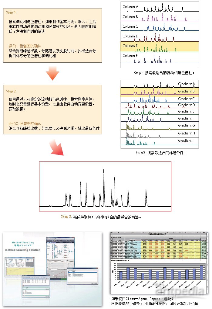 一旦开始了分析,之后由专用软件"Method Scouting Solution"自动切换色谱柱与流动相,实施分析。在无人值班的夜间和休息日也可实施分析,使分析工作者从方法文件制作、流动相配制以及色谱柱更换等繁琐的作业中解放出来。这种协同效应提高方法开发通量多达10倍以上。