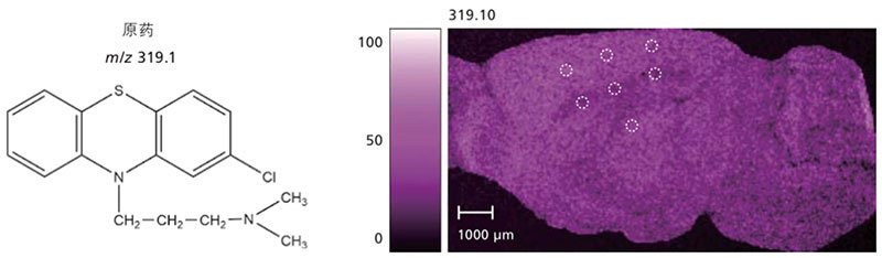 iMScope QT检测氯丙嗪给药的小鼠组织切片。无需标记即可观察到原药的分布以及不同部位的含量差异。