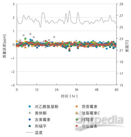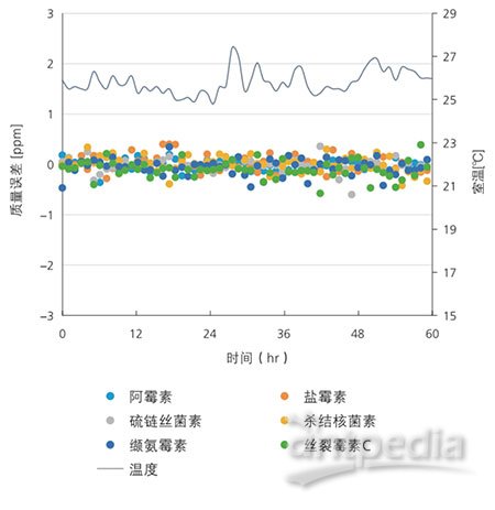 LCMS-9030即使在易受温度变化的实验室条件下, 智能温度控制系统也能确保稳定的质量测定准确度。我们使用本产品对分子量从150 至 1700 Da的各种标准品进行了60小时的连续分析,检测前进行单次质量校正。分析在正常实验室温度波动环境25℃至28℃之间进行。