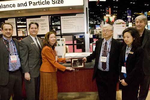 照片为Eillen M. Skelly Frame博士(国际科学交流编辑)为Haruo Shimaoka博士颁奖 (岛津粒度产品经理)。图片左侧为Stefan Fritsch(仪器新闻)和 Bob Clifford博士(岛津工业业务部门经理),右侧为Yang Yanyin博士(岛津产品专家)、Brian Howard (出版商及主编,国际科学交流交流股份有限公司)