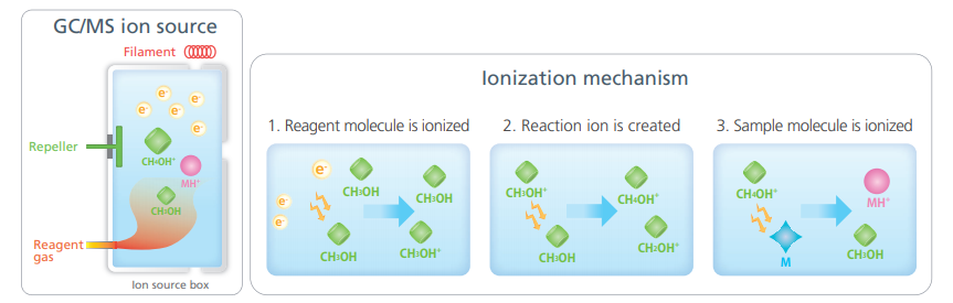 SMCI代表溶剂介导的化学电离,这是GCMS的一种软电离方法。来自样品瓶的顶空反应气被引入GCMS电离单元进行电离,然后通过质子化*引起目标分子的化学电离(CI)。以前的CI方法要求使用易燃的反应气瓶,但是SMCI可以与一般的有机溶剂(例如甲醇或乙腈)以及氮气或氩气一起进行。这样可以提高安全性并降低运行成本。