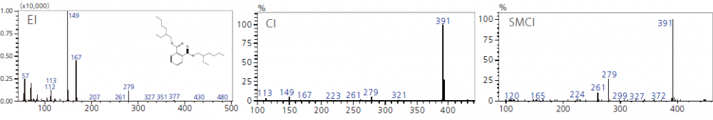 使用不同电离方法获得的邻苯二甲酸二(2-乙基己基)酯的质谱(MW = 390)