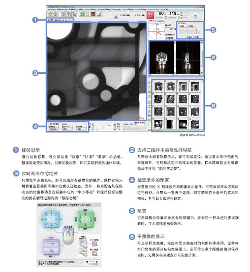 SMX-3500M拥有支持大型样本检查的载物台和防护箱,是能够通过微焦X射线装置与大视野检出器的结合,就可观察和检查出压铸铝等产品内部缺陷的X射线透视装置。只要一个鼠标就可以实现所有操作,提供迅速观察和检查的环境。