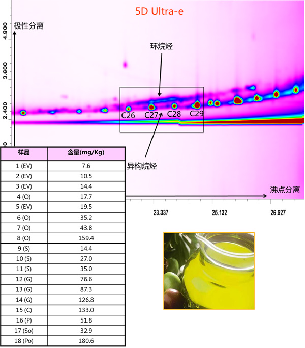 5D Ultra-e系统是岛津独有的特色分离系统的再次绽放,基于双柱箱的全二维色谱技术结合超快速三重四极杆型气相色谱质谱联用仪GCMS-TQ8040,同时系统前端搭载HPLC在线分离系统,提升全二维色谱分离能力的同时体系自动化程度大幅提高,分析效率卓越改进。5D Ultra-e是目前可以提供zei更高分离度和更高选择性的分析系统,是超复杂化合物分离分析强有力的对应工具。 什么是5D? 5D是怎么工作的? 5D系统应用在哪里? 植物油中矿物油含量的分析 煤焦油分析