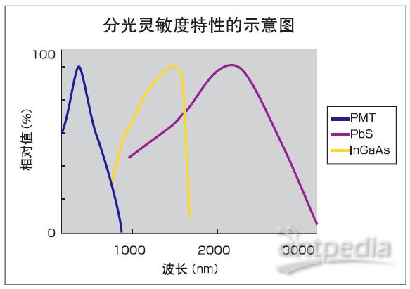 传统的紫外可见近红外分光光度计在紫外可见区使用PMT(光电倍增管),近红外区使用PbS检测器。但是,由于在波长1000nm附近上述两种检测器的灵敏度都低,难以进行高灵敏度测定。而SolidSpec-3700i/3700i DUV使用在此转换波长区内具有灵敏度的InGaAs检测器,可以进行近红外区的高灵敏度测定。