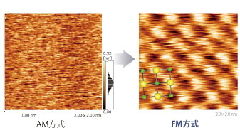 图为在饱和溶液中观察NaCl表面的原子排列。以往AFM(AM方式:左)湮没在噪声中的原子通过FM方式(右)则可以清晰地观察到。