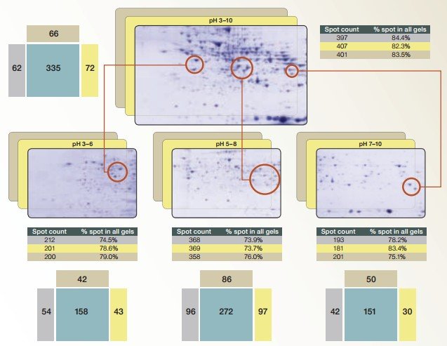 PROTEAN i12 IEF系统可以在一次运行中,使用不同pH范围的IPG胶条,从而获得最大限度的分离效果。选择pH3-10的宽范围胶条,比较其与pH3-6,pH5-8,pH7-1三种窄范围胶条重叠所获得的2D图,四种胶条同时运行,一次便可获得所有数据。红圈内突出显示了窄范围胶条的高分辨率,表格内显示了三条重复胶条内检测到的蛋白点数,说明重复性非常好。