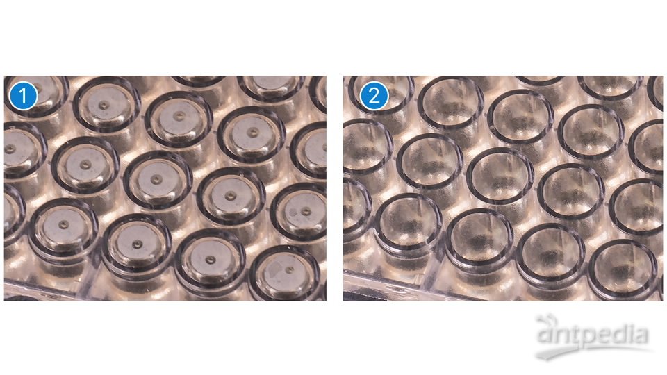 抗凝集功能可以在孔板的顶底部进行梯度温控,以防密封的孔板内出现凝集,导致光散射和检测干扰。(1) 孔板密封膜内部的凝集会导致测量不准确和不一致。(2) LogPhase 600 中的抗凝集功能可防止凝集,在整个动力学检测过程中实现一致的数据采集。
