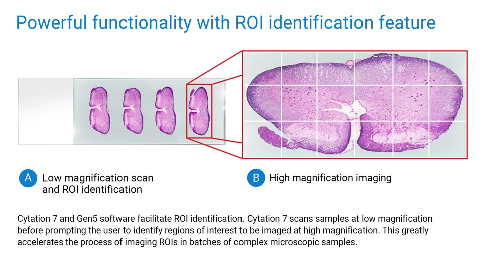 Cytation 7 和 Gen5 软件有助于 ROI 识别。Cytation 7 先在低倍率下扫描样品,然后提示用户识别需要在高倍率下成像的感兴趣区域。这大大加快了批量复杂显微样品的 ROI 成像过程。