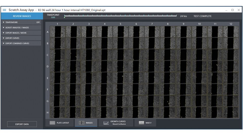 划痕实验应用程序可自动采集图像并分析划痕宽度、划痕汇合度和划痕最大愈合速率。