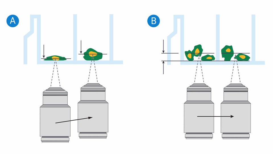 A. 所有的 Agilent BioTek 成像系统均能进行基于图像的自动聚焦。它聚焦于样本中对比度最高的平面,包括孔内“移动”的生物体。 B. Agilent BioTek 专有的自动聚焦方法使用来自每个成像孔或区域所特有的激光识别界面的相同偏焦量。它通常更快,适用于微弱的荧光团,有助于防止光毒性和光致漂白效应。激光自动聚焦还能在长时间动态成像中提供更好的重现性和更高的准确度。 Agilent BioTek 激光自动聚焦技术 >