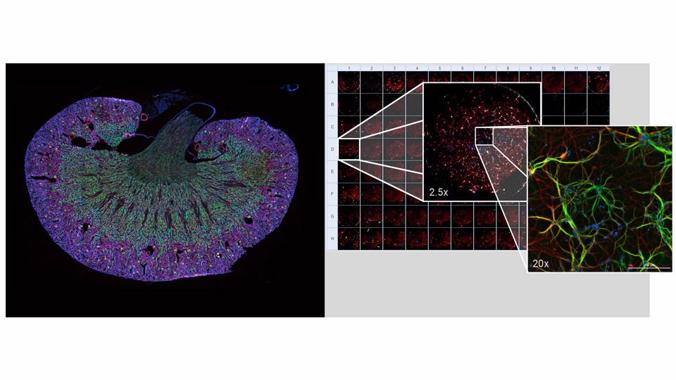 宽视场 (WFOV) 摄像头可以对微孔板和玻片提供快速、自动化的成像。大组织切片(左)和微孔板(右)可以按从低到高放大倍率成像。