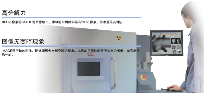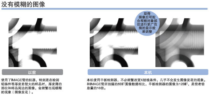 使用了IMAGE管的机器,特别是在检测铝铸件等厚度差较大的样品时,厚度薄的部位和没有样品的地方的图像,会频繁出现模糊的现象(图像发花)。而本机因为使用了高输出的微焦X射线装置和平板检测器,可以得到高像素、没有歪斜的清晰图像。