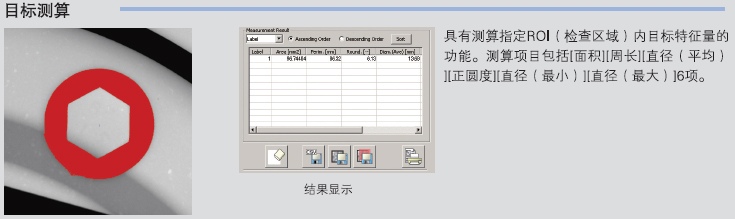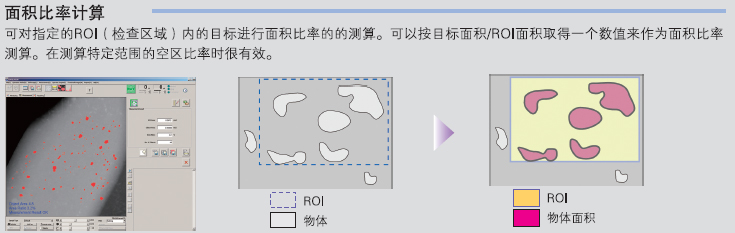 除了尺寸计测和指定范围内的面积比率测算,还标准配备了面积• 周长等的目标测量。不需要另外准备软件,移出数据这样繁琐的操作。