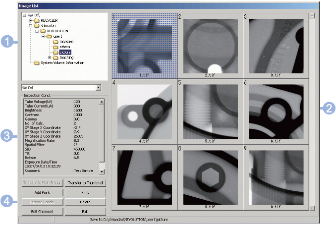 经常使用的x射线条件和图像显示条件可以加上样品名保存起来。只要从一览表中进行选择,调出适合想看的样品和部位的条件,就可以在瞬间实现设定。