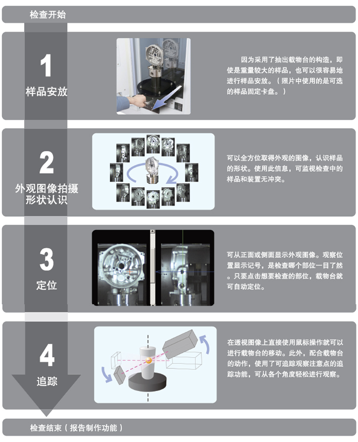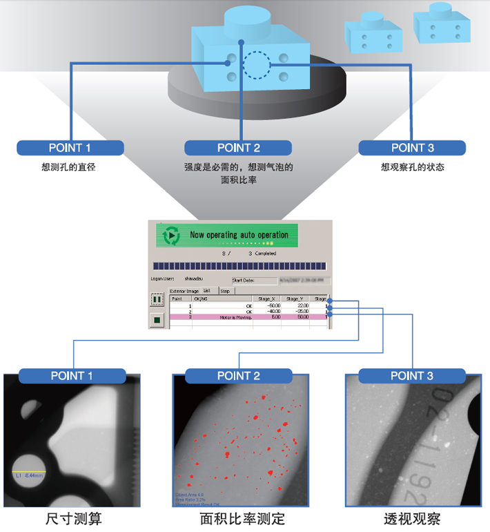 · 不只是载物台的位置定位,还可以登录每个点的X射线条件和各种图像测算功能。这种高级功能在以往的范用机器中是没有的,现在则可以以半自动的方式进行。
