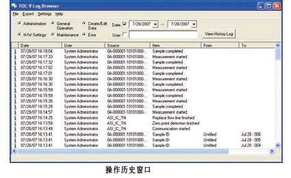 由TOC- Control L/V软件和测定仪器取得的操作记录可以自动维护。除了与操作相关的日期和用户名称外,可以跟踪设置的细节变化以及仪器工作状态。
