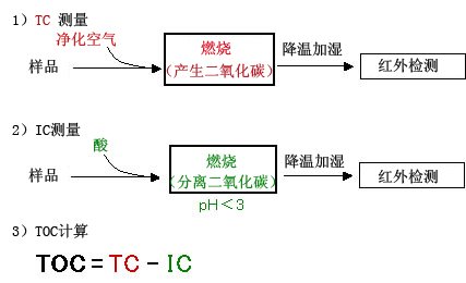 样品被送到充满纯净空气的燃烧炉。在那里,通过使用铂金催化剂和加热到680℃使样品燃烧,并分解、转化为二氧化碳。生成的二氧化碳被冷却和除湿后用NDIR检测。样品中的TC浓度(总碳)是通过校准曲线公式得出的。1)此外,使氧化样品进入吹扫过程,样品中的IC(无机碳)被转化为二氧化碳,通过NDIR检测IC浓度。2)然后从获得的TC浓度中减去IC浓度计算出TOC浓度。3)NPOC(不可吹扫有机碳)测定 。