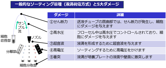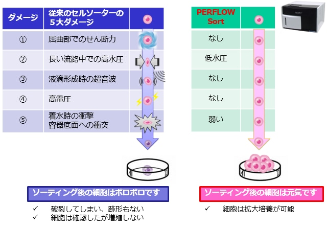 与传统的细胞分选仪不同,PERFLOW®Sort(古河电机工业株式会社)在分离细胞时不使用超声波或高电荷,而是通过在水压为传统细胞的1/10或更低的条件下输送液体,它是一种无损细胞分选仪,可将分离过程中的主要物理损伤因素降低到最大程度。