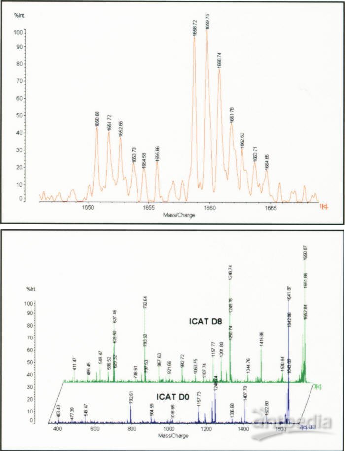 将ICAT*标识多肽样品(嗜盐菌提取物经碎片收集离子交换)点在样品靶上。多肽斑点由ICAT标识配对分析。经MS鉴定后(图5a),单同位素离子对由MS/MS确认配对和鉴别(图5b)。-能在同一平台上完成此项分析标志AXIMA-QIT在蛋白质组学研究领域(使用ICAT技术和翻译后的修饰)的强大功能。
