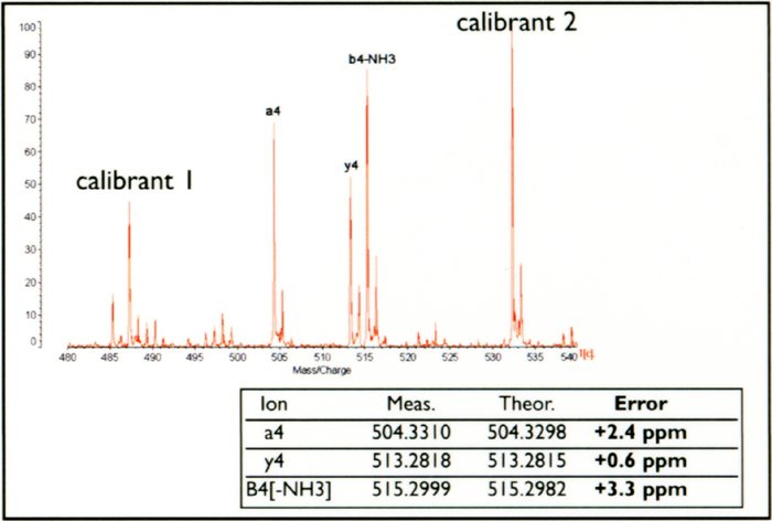 无论采用何种MS方式,均可获得高质量准确度及更高的数据库检索和目标样品分类,图1表示了根据内标法得到的极高质量准确度,样品为血管紧缩素II经MS3的离子质谱图。