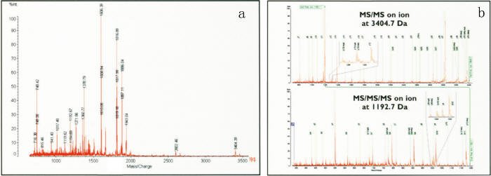 在图4a中,选择质量为3404.70的离子进行MS/MS分析(图4b),之后进一步选择质量为1192.7的离子经MS/MS/MS分析,从而得到新的结构信息。-该种巨大的多级MS功能扩大了MALDI离子源可能的选择范围。