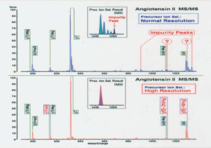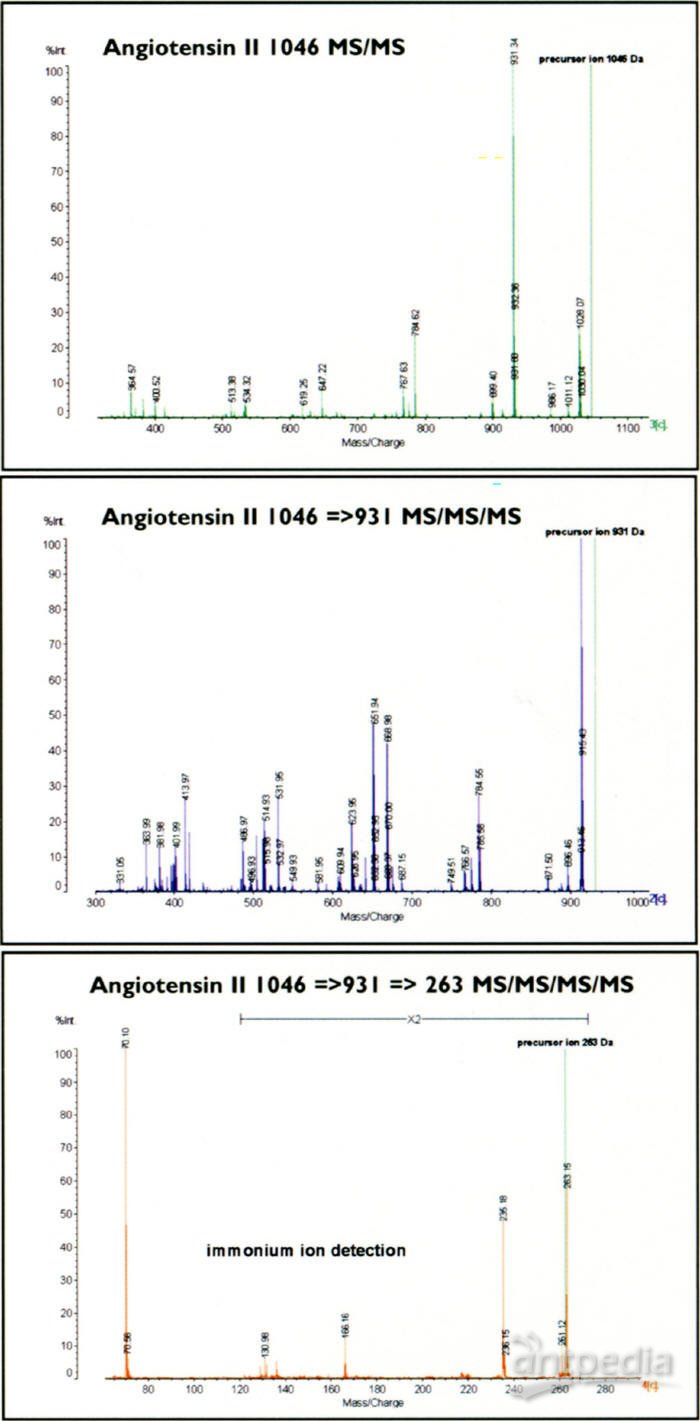 离子选择分辨率>1,000,可个别分析母离子图谱至单位道尔顿质量数。对于MS/MS研究来说,选择单一同位素能够排除可能的背景噪音,增强了对破碎方式的分析,如图3中血管紧缩素II的MS/MS图谱所示。
