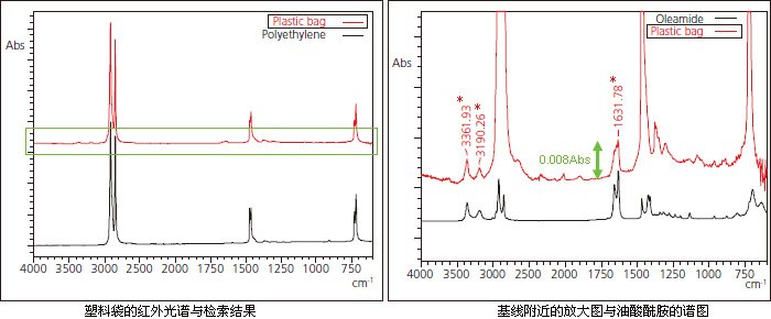 塑料袋的测定结果与聚乙烯的谱库谱图一致,可知主成分为聚乙烯。放大基线附近。发现来自塑料袋中所含添加剂的峰(图中*),与油酸酰胺等脂肪族酰胺的谱图一致。脂肪族酰胺是因起到润滑剂的作用而添加在树脂中的物质之一。