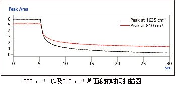 表示1635 cm-1 以及 810 cm-1 的峰面积时间扫描图。紫外线照射后的数秒内,这些峰急剧地减少了。