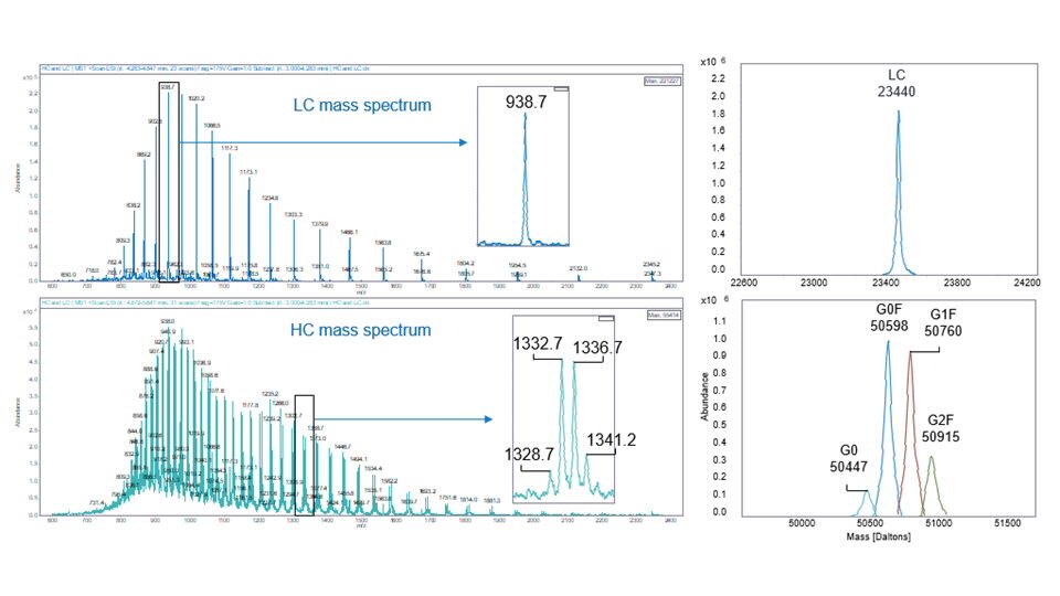 使用 Pro iQ Plus 单四极杆质谱仪进行完整蛋白质质量数确认和糖基化分析,为蛋白质治疗药物的研发和生产提供支持。在完整蛋白质和亚基水平对曲妥珠单抗进行检测,可以提供各种糖型的相对丰度,这是质量控制中的一项重要质量指标。